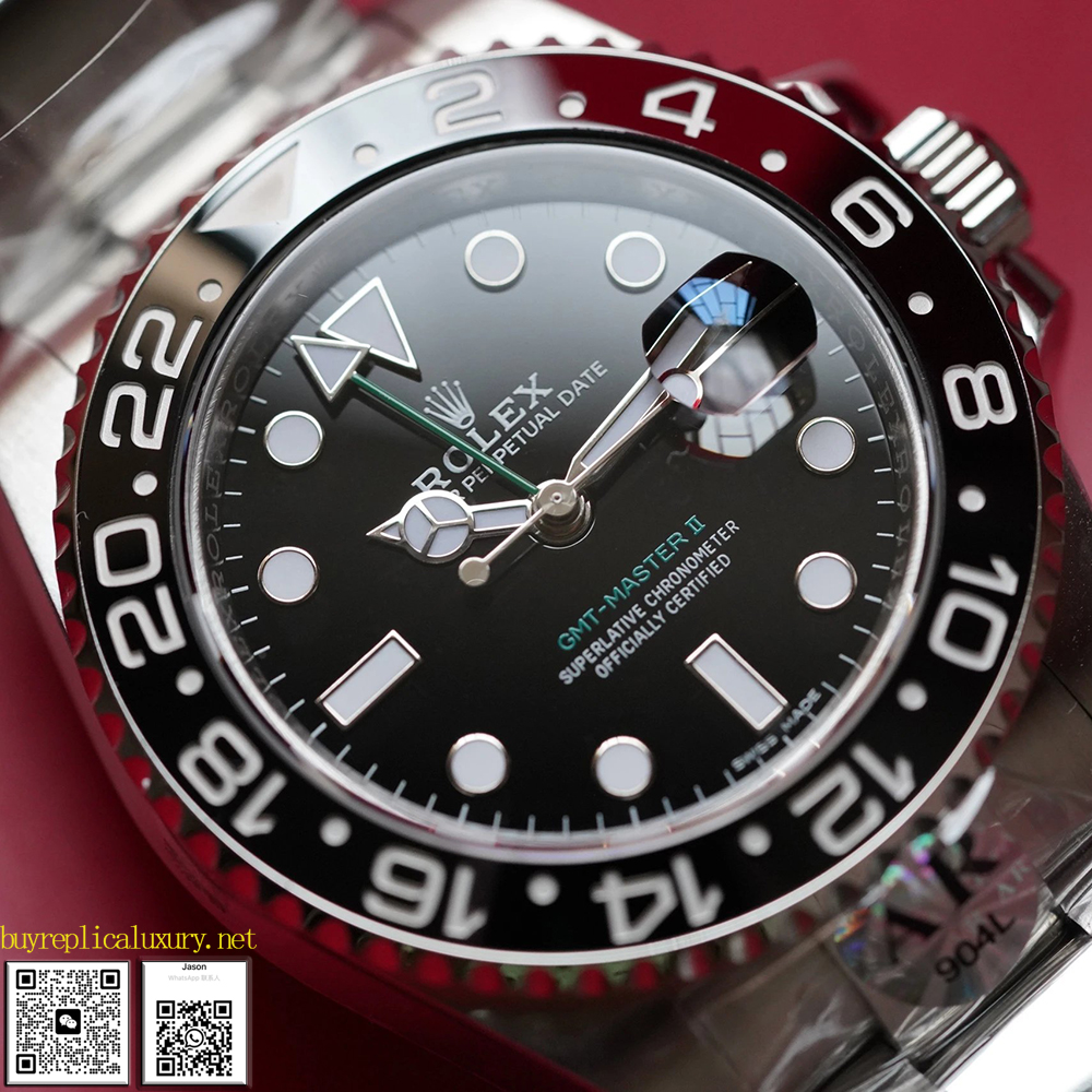 Das auffälligste Merkmal dieser Uhr ist ihre zweifarbige schwarze und graue Cerachrom-Lünette. Dies ist das erste Mal, dass Rolex diese beiden Farben auf einer GMT-Keramiklünette kombiniert hat. Die Verwendung von Grau, einem neutralen und eleganten Farbton, zusammen mit klassischem Schwarz schafft einen monochromen und äußerst vielseitigen Look, der dezenter ist als die klassische "Pepsi" oder "Batman", aber ebenso wirkungsvoll. Die Lünette ist aus der äußerst kratzfesten und lichtechten Rolex-Keramik gefertigt, die Ziffern und Skalen sind präzisionsgeformt und mit Platin beschichtet, um eine dauerhafte Ablesbarkeit zu gewährleisten.