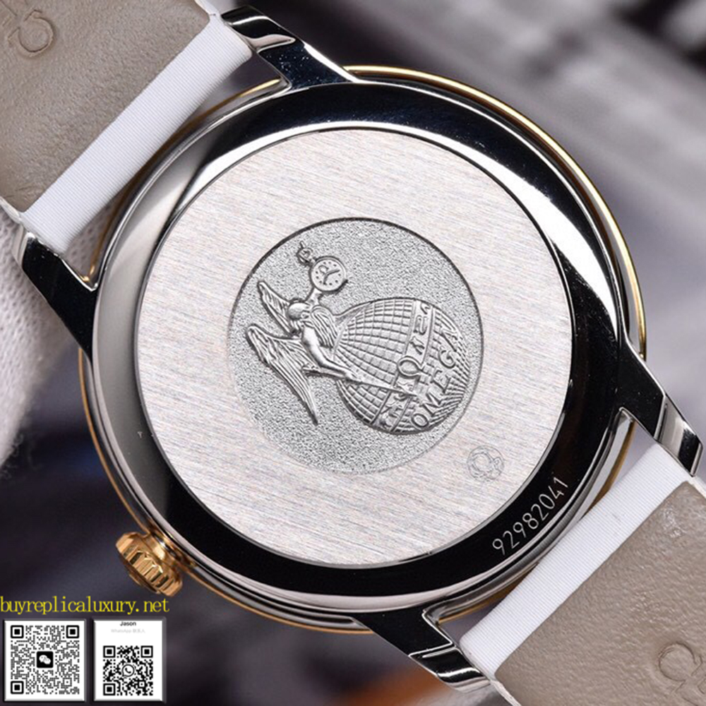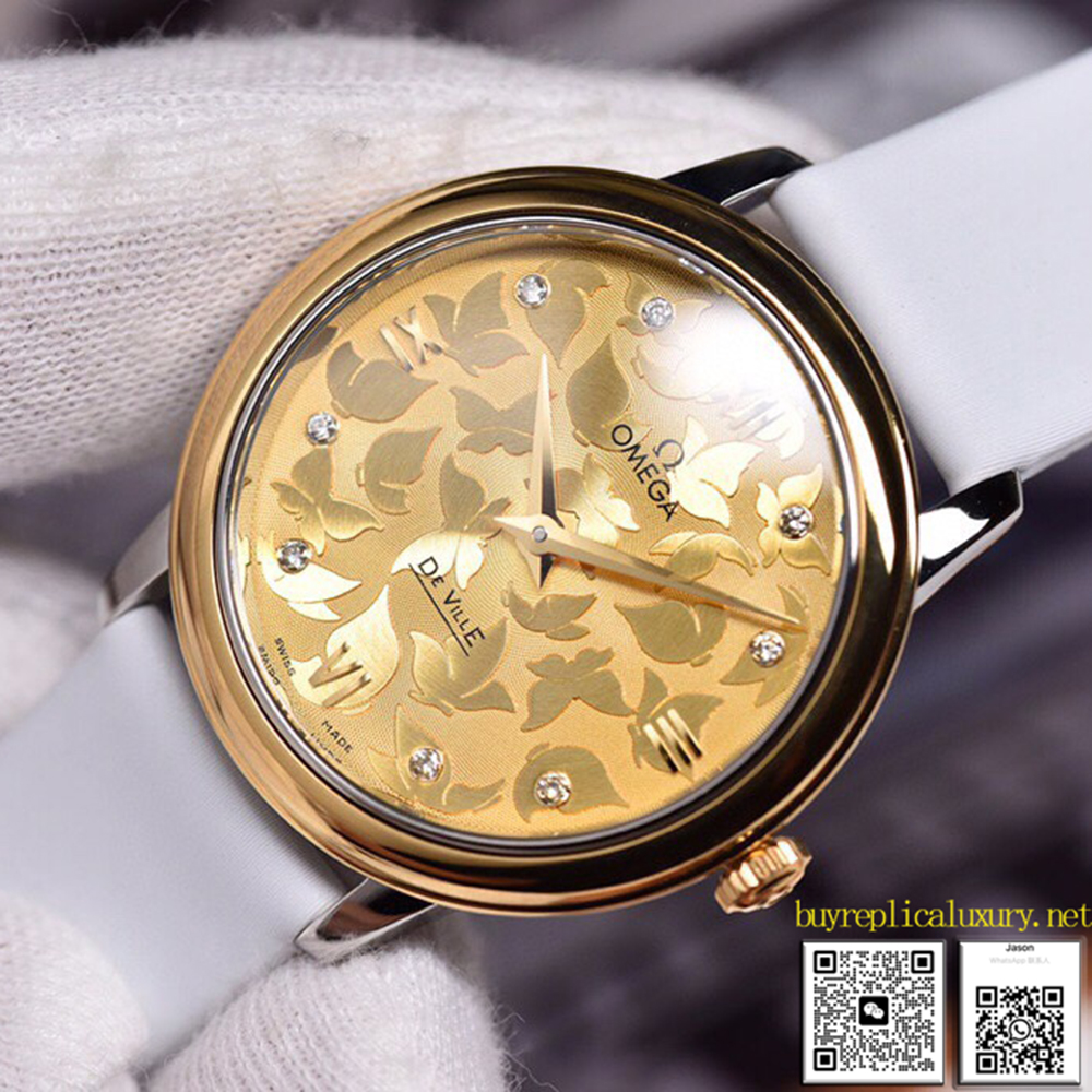 The Omega Delta Fly Elegant Series Butterfly Dance 32.7mm watch features a white mother-of-pearl dial, paired with a 18K gold and stainless steel, 18K red gold and stainless steel, or sleek stainless steel case. On the charming dial, the polished butterfly is dancing gracefully, becoming even more prominent due to the contrast between the engraved contour lines and the matte background. The hour markers, polished arc-shaped polished Roman numerals and diamond markers, are complemented by those that have been plated in red gold, gold or rhodium, showcasing a refined texture. Buy fake Omega Women’s Watch Discworld Series, fake vs real Omega.