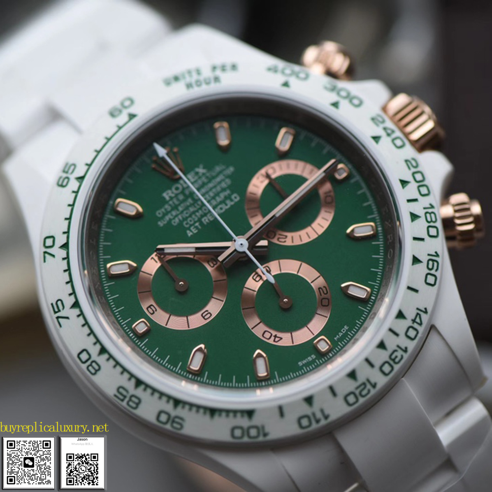 To honor the legacy of British Racing Green—a color once synonymous with racing speed, but largely absent from modern motorsports since F1 abandoned national colors in 1970—AET REMOULD has designed a limited edition timepiece named British Racing Green. Buy Rolex AET modified, fake rolex watch white porcelain gold Daytona.
